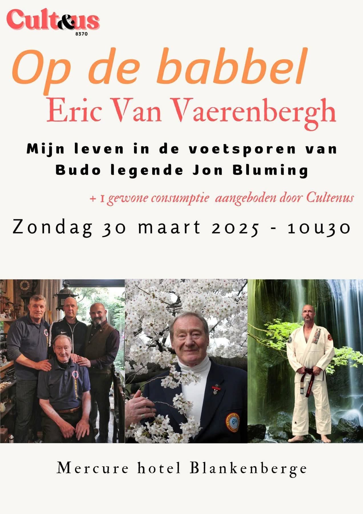 Op zondag 30 maart 2025 gaven moderator Enzo Farina en gastdocent Eric Van Vaerenbergh, in samenwerking met Cultenus, de lezing “In de voetsporen van Budo legende Jon Bluming” in het Mercure hotel te Blankenberge. Een vijftigtal personen waren aanwezig en volgden nauwlettend de lezing. Na de lezing kwamen veel personen Eric Van Vaerenbergh feliciteren met de uiteenzetting waarover heel wat mensen onder de indruk waren. Het was ook een absolute eer en voorrecht dat niemand minder dan de zoon van Budo legende Jon Bluming, met name Jon Bluming Jr. en zijn vriendin Caroline Van Zoest, aanwezig waren. De dag voordien namen Eric Van Vaerenbergh en zijn echtgenote Lynn Peene het koppel dat speciaal uit Amsterdam gekomen was mee op een prachtige uitstap doorheen Brugge. Speciale dank aan alle aanwezigen en aan het ganse Cultenus team dat zich uit de naad werkte om dit allemaal te kunnen bewerkstelligen!
